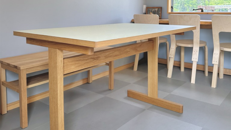 メインのテーブル オーク材のやさしい色合い。天板には淡いグリーンのリノリウム。