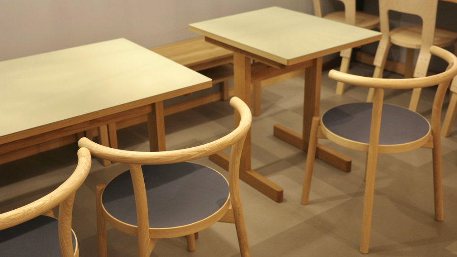 丸い椅子 これは北海道旭川の家具。座面にはやはりリノリウム。クッション性はないですが、店のイメージに合ってると思います。学生時代に過ごしていた旭川の家具を使いたかったこともあります。
